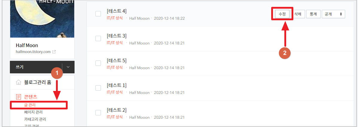 1. 블로그관리에서 콘텐츠 - '글관리' 클릭