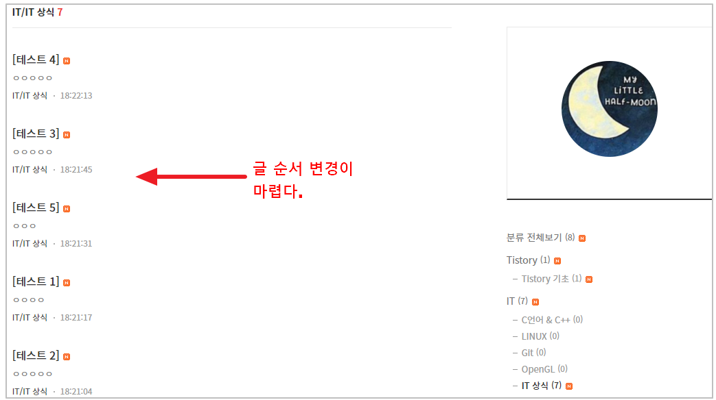 (아주 오래전 글의 순서를 바꾸고자 한다면 매우 번거로울 듯.. 애초에 글 순서를 잘 쓰는 것 말고는 방법이 없다ㅠㅠ)