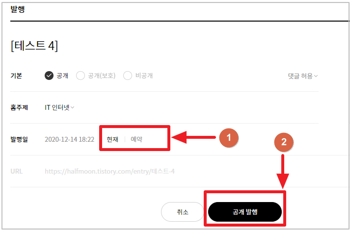 3. 발행일을 현재(또는 예약)으로 변경 - '공개발행' 클릭