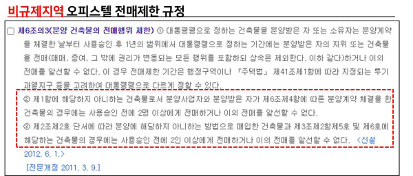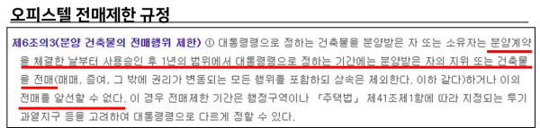 ① 조정대상지역 내 100실 이상 규모의 오피스텔 : 전매제한 1년 (등기 후 1년 후 매도 가능)