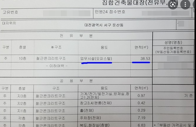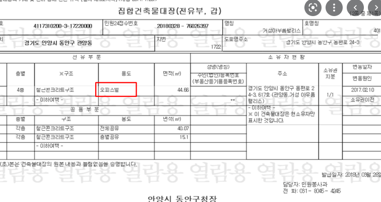 - 건축물대장을 보면 주거용 오피스텔은 '오피스텔' 업무용 오피스텔은 '업무시설(오피스텔)'로 표기된다.