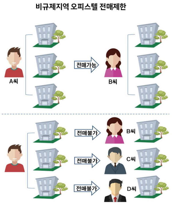 하지만 건축물 분양에 관한 법률에서 모든 건축물 분양시 ‘2명 이상에게 전매하거나 전매를 알선할 수 없다’는 규정이 있습니다. 가격이 저렴하고 규제가 적다고 해서비규제지역 오피스텔을 여러 채 샀다간 큰 낭패를 볼 수 있습니다. 비 규제지역의 동일한 사업지에서 분양하는 오피스텔은 살 때는 여러 개를 사도 상관없지만, 완공 전 전매할 경우 한 사람에게 다 팔거나 여러채 중 한 채만 한 사람에게 팔아야 합니다.