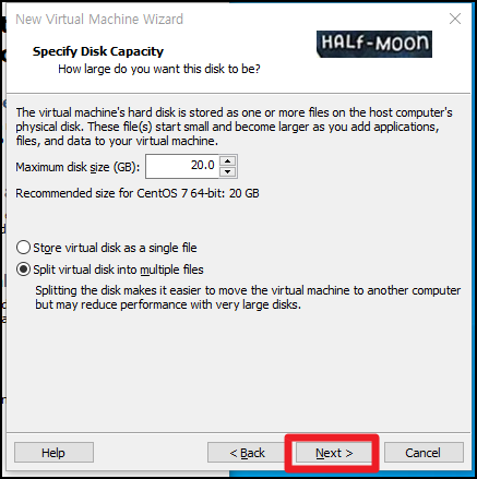 실제 물리 파일의 크기는 겨우 10MB 정도로 설정되지만, 가상 메모리 기법을 사용해 이 10MB짜리 하드디스크를 20GB짜리라고 속이는 효과를 내는 게 가상메모리입니다. 20GB 그대로 설정 후 Next 클릭합니다.