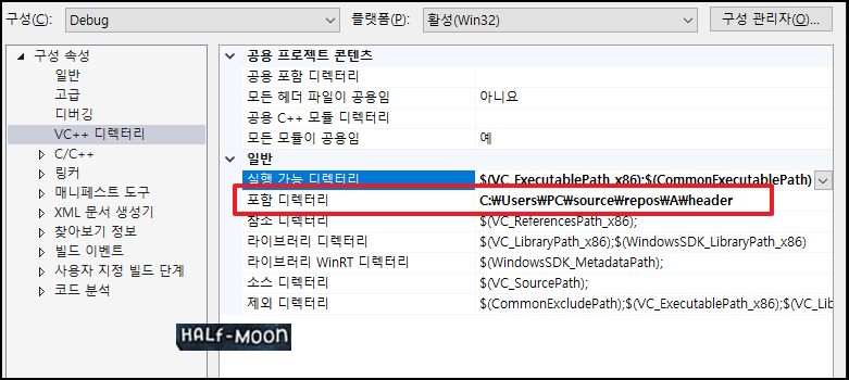 '$(IncludePath);C:\\Users\\PC\\source\\repos\\A\\header' 입력(절대경로입력)