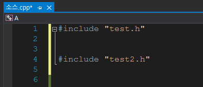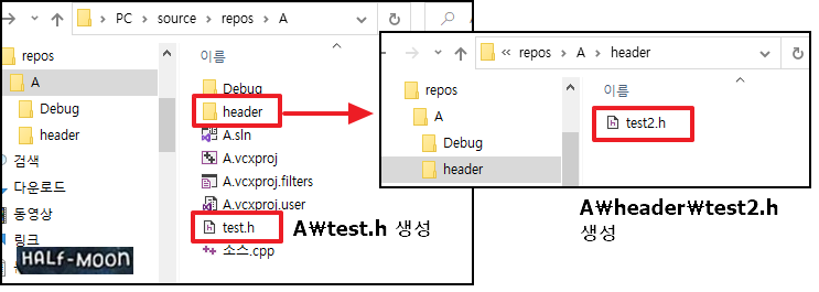 예) 아래와 같이 A 프로젝트를 생성 후 A\\test.h를, A\\header\\test2.h 헤더파일을 각각 생성했다.