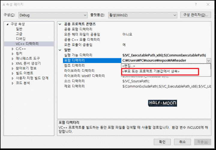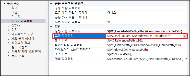 - '구성 속성 - VC++ 디렉터리 - 포함 디렉터리'에 디폴트로 시스템 헤더 경로가 저장되어있다.