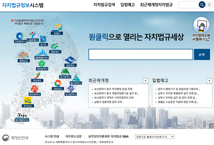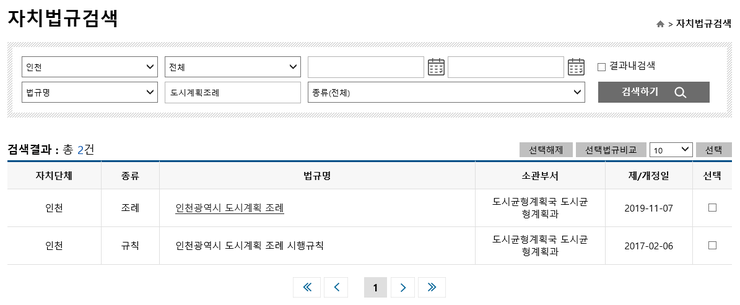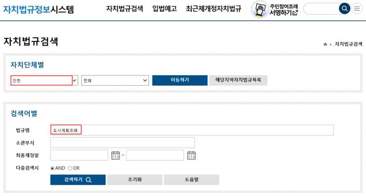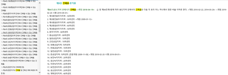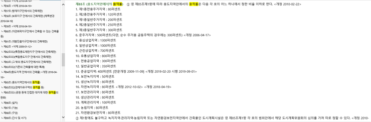 인터넷으로 '자치법규정보시스템(www.elis.go.kr)'을 검색하시면 다음과 같은 행정안전부 자치법규정보시스템 사이트가 뜹니다.![]() 다음에 화면 상단의 자치법규검색 탭을 클릭하면 아래와 같이 자치법규검색의 창이 나타납니다. 이제 원하는 자치단체별 법규를 검색하면 됩니다. 건페율과 용적률은 각 자치단체별 조례에 규정되어 있으므로 인천광역시 도시계획조례를 한번 검색해보겠습니다. ![]() 검색하기를 눌러서 검색결과상의 인천광역시 도시계획 조례를 클릭하면 "인천광역시 도시계획 조례"의 전 조문을 볼 수 있습니다. ![]() 여기서 내가 원하는 '건폐율"과 '용적률'을 검색하게 되면 '국토의 계획 및 이용에 관한 법률'의 한도내에서 실제 적용되는 건폐율, 용적률을 알 수 있습니다. 또한 조문내용의 특정단어찾기는 'Ctrl+f'키를 눌러서 찾으시면 됩니다. 'Ctrl+f'를 누르면 왼쪽 상단에 찾기 창이 뜨는데 여기에 '건폐율' 또는 '용적률'치고 엔터키를 누르면 바로 해당 조문으로 이동하게 됩니다. ![]() ![]() |