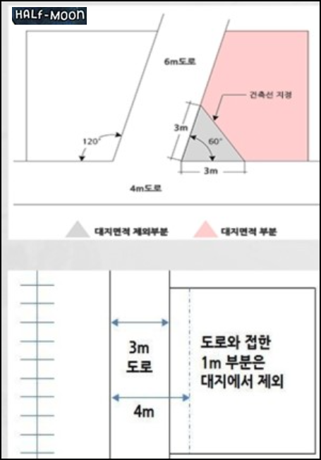 - 2개의 도로가 접하는 경우 : 3m씩 대지면적에서 제외됩니다.