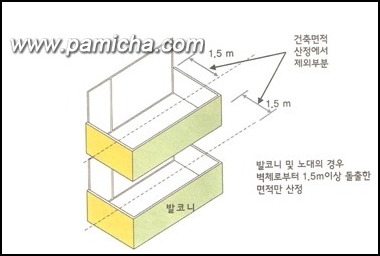 - 발코니 1.5m 이상 돌출된 면적만 건축면적으로 산정