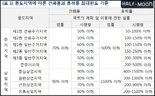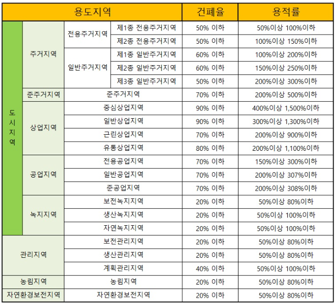 건폐율과 용적율은 지역의 용도에 따라서 크기가 달라집니다. (아래 표 참고)