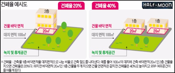 즉, 건폐율이 클수록 건물을 넓게 지을 수 있다는 뜻입니다.