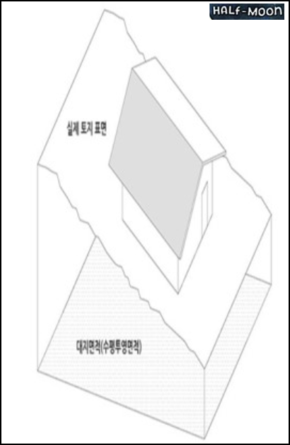 - 대지의 수평투영면적을 대지면적으로 산정합니다. 즉, 언덕이 가파를수록 실제 토지에 비해 대지면적이 작게 산정됩니다.