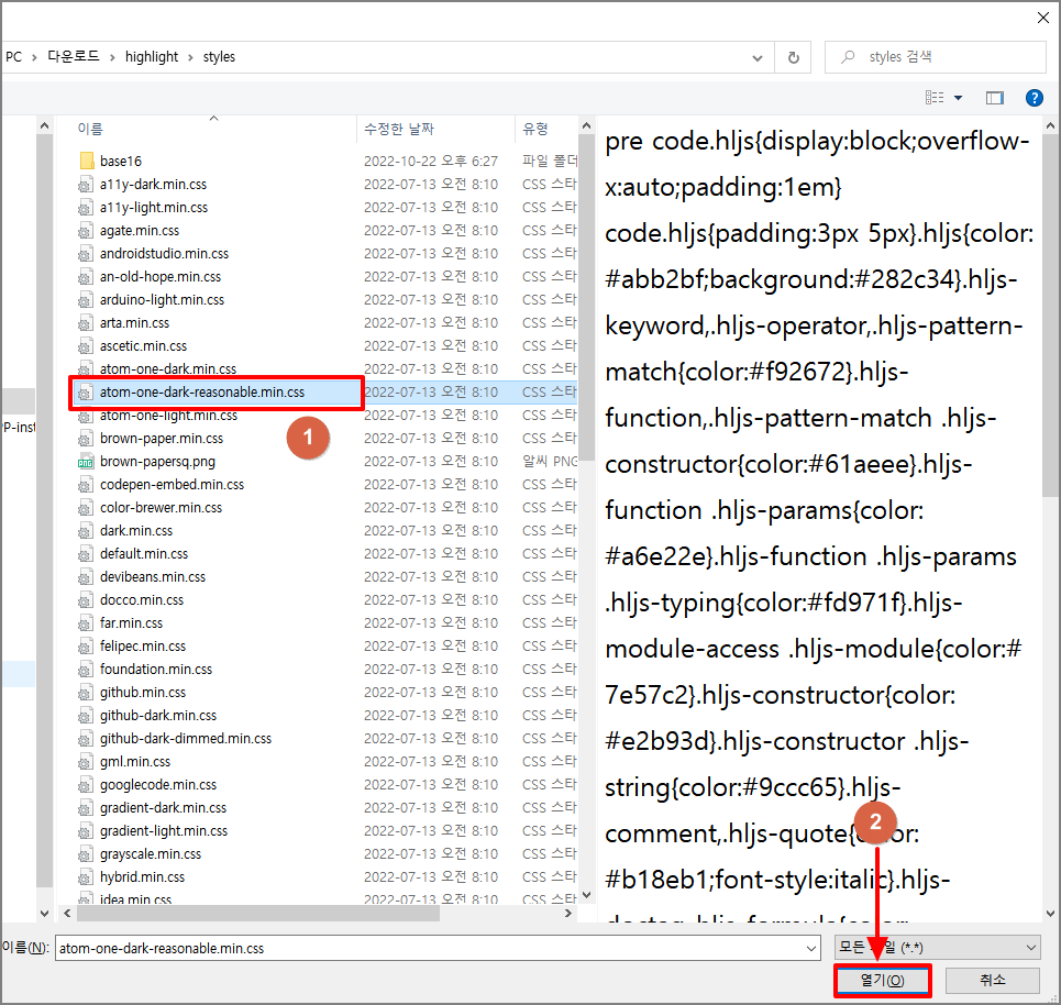 포맷 파일 위치(압축풀기 한 파일 내) : \\highligh\styles\atom-one-dark-reasonable.min.css