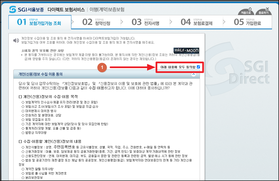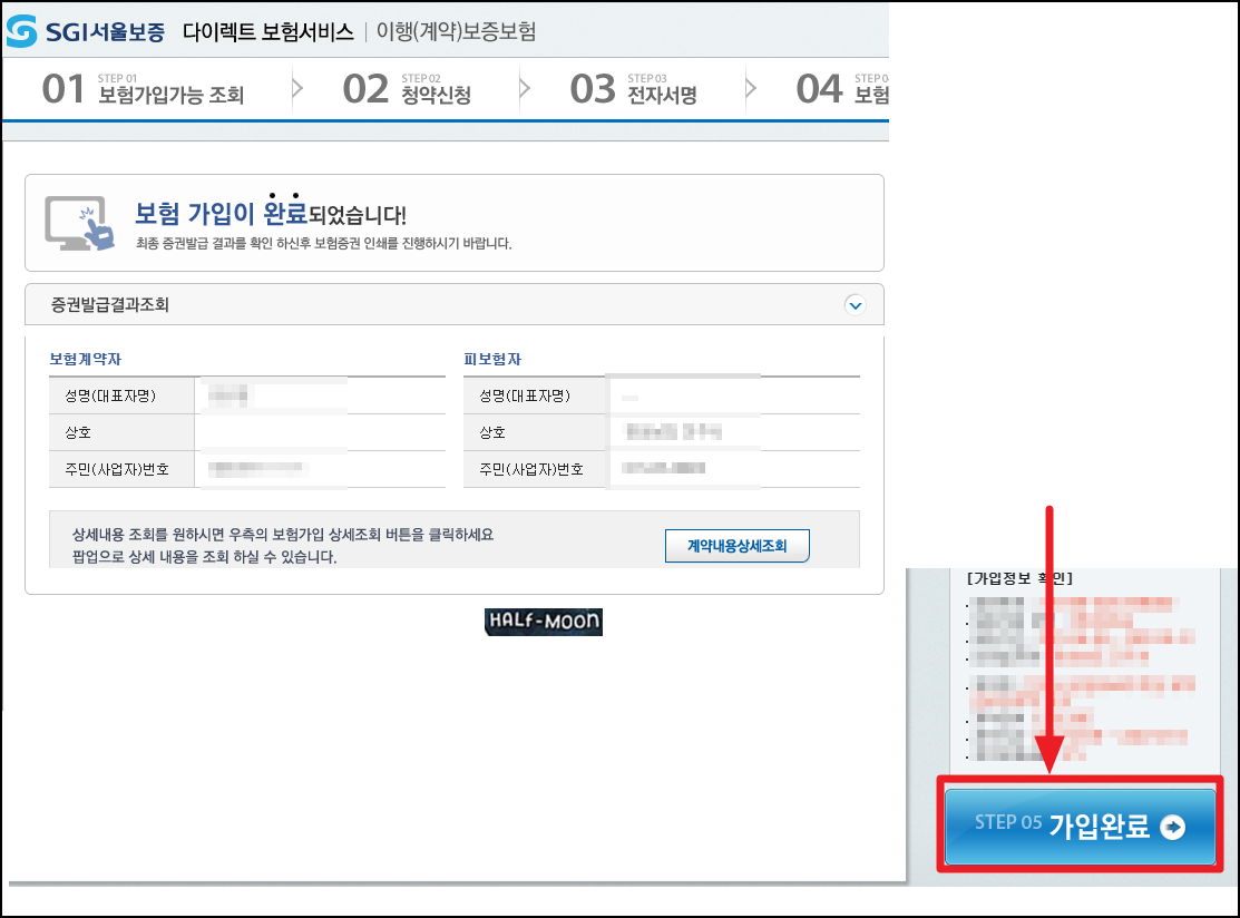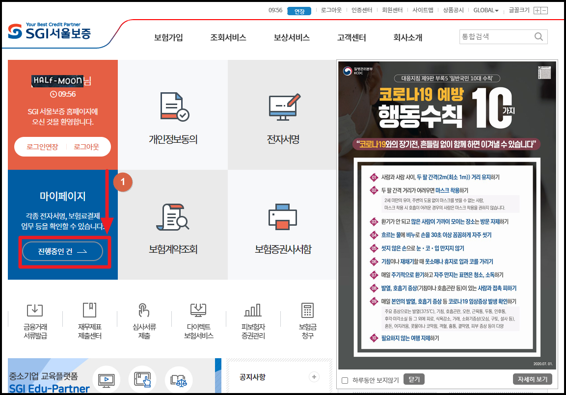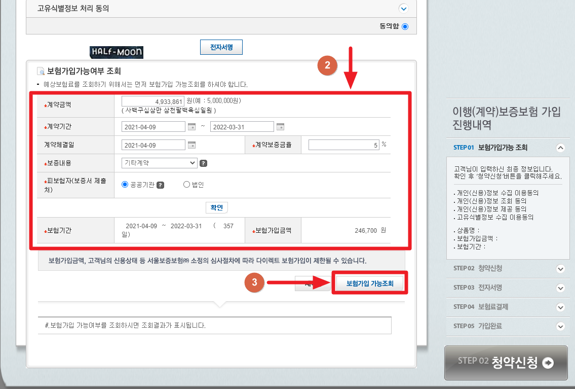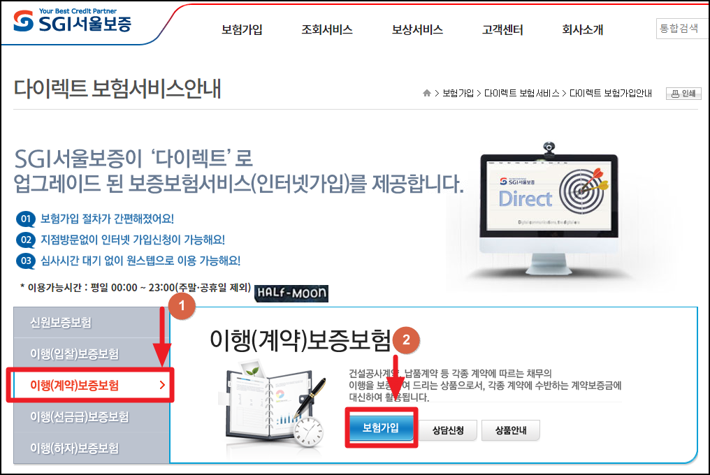 1) '이행(계약)보증보험' > '보험가입' 클릭