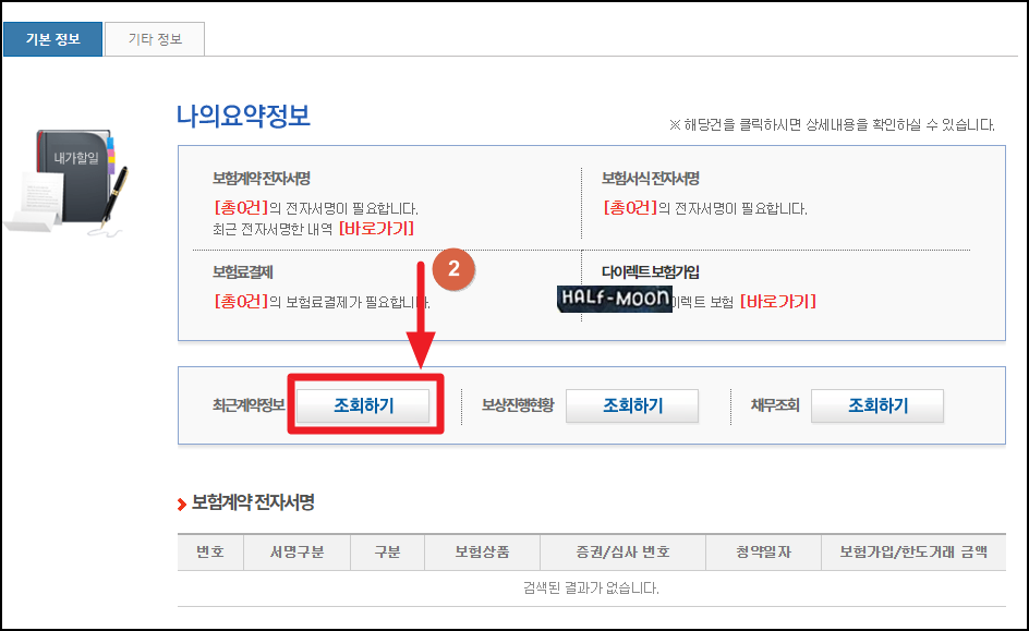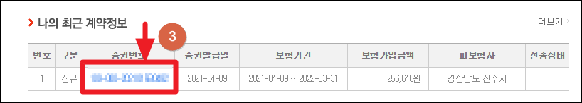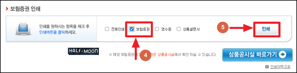 6) 인쇄 : '진행중인 건' 클릭 > 최근계약정보 '조회하기' 클릭 > '증권번호' 클릭 > '보험증권' 클릭 후 '인쇄' 클릭