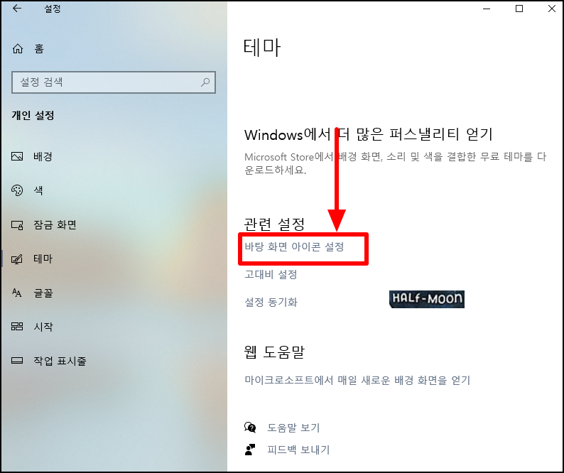 ▲ 테마에 들어와서 오른쪽에서 스크롤을 내리면 위에 보이는 관련 설정 - 바탕 화면 아이콘 설정이 보일 것입니다. 이곳에서 파란색으로 되어 있는 바탕 화면 아이콘 설정을 클릭합니다.