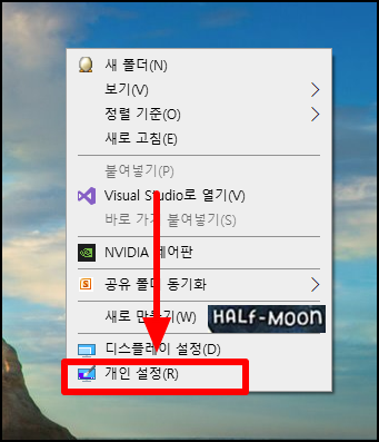 ▲ 바탕화면에서 오른쪽 버튼을 누르고 개인 설정(R)을 클릭합니다.