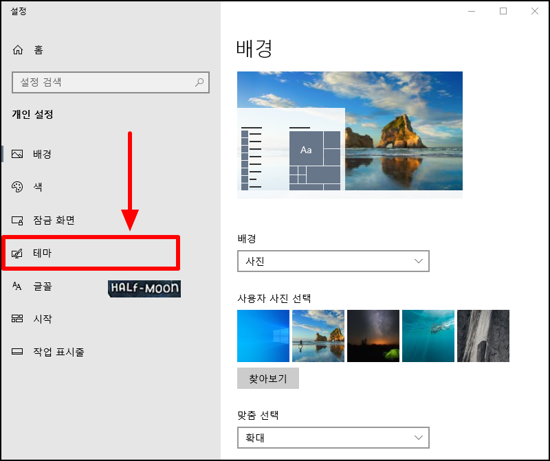 ▲ 클릭하면 설정 창이 나오는데 왼쪽을 보면 테마 메뉴가 있을 것입니다. 이 테마 메뉴를 클릭합니다.
