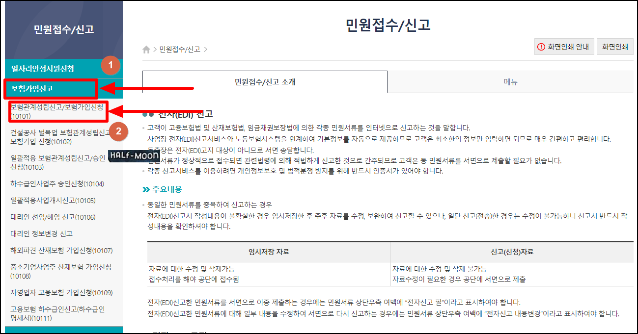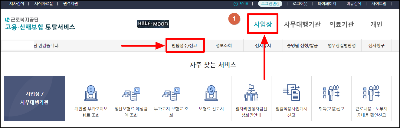 1. 공인인증서 로그인 > 사업장 > '민원접수/신고' 클릭