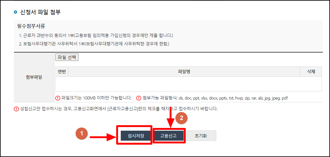 이후 모두 입력하였으면, 임시저장을 반드시 누르고 고용신고 클릭한다.