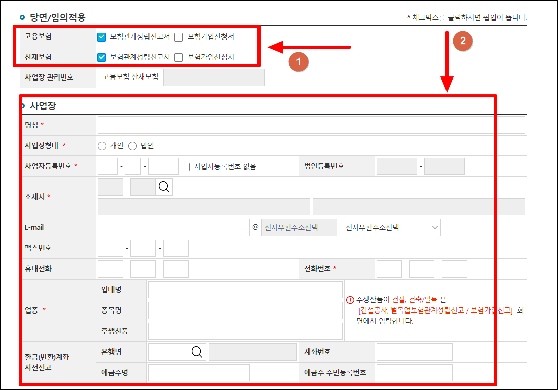 ※ 보험가입신청서는 고용/산재보험 가입의무가 없는 업종에서 선택하는 체크박스이다. 무시하면됨