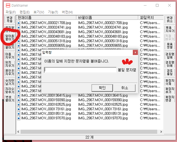기존 이름에서 앞/뒤에 일괄적으로 이름을 넣어주고 싶을 경우 선택하는 방법