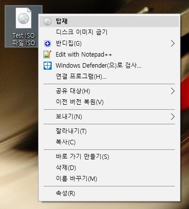 만약 ISO 파일에서 마우스 우클릭시 "탑재" 메뉴가 보이지 않는다면 아래 링크 내용을 참조하여 해결해 보시기 바랍니다.