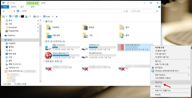▼ 또한 가상 드라이브 꺼내기는 윈도우10 가상 드라이브 ISO 파일 자체 기능 사용법으로 만든 드라이브에서 마우스 우클릭 하여 [꺼내기] 항목을 선택 하면 드라이브 삭제가 됩니다.