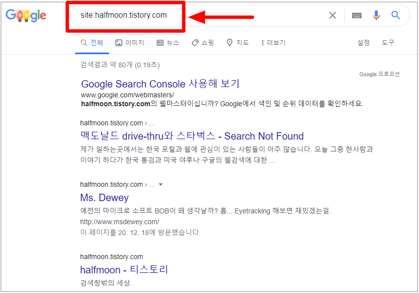 예를 들어, 내 티스토리 주소인 (halfmoon.tistory.com/)을 입력하면 내 블로그에 포스팅 된 글들을 볼 수 있다.