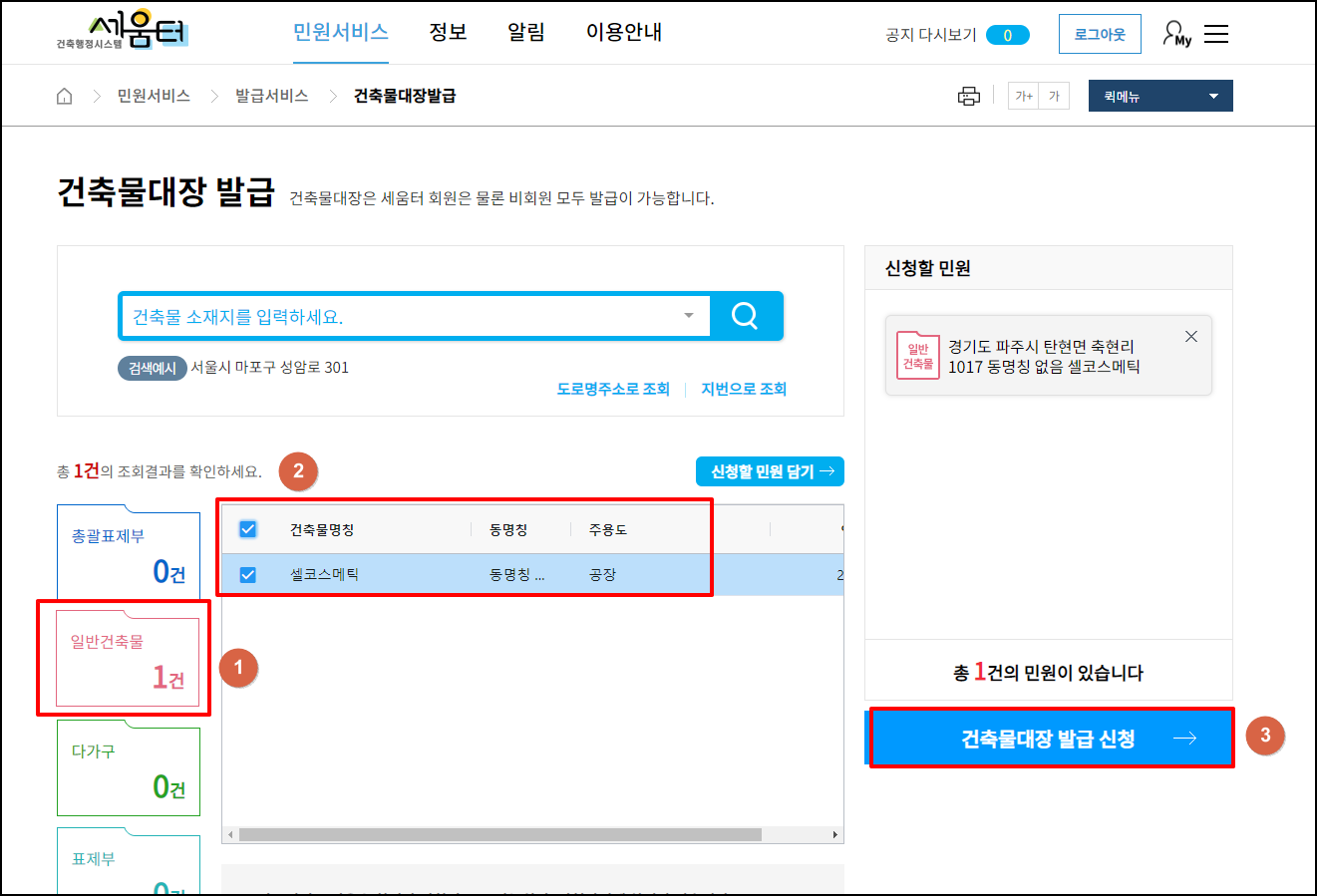 4) 일반건축물(1건) - 선택 후 신청할 민원담기 - 건축물대장 발급 신청 클릭