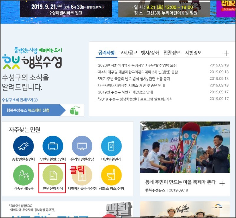 위는 대구의 동구청의 초기화면이고, 아래는 수성구청의 초기화면입니다.