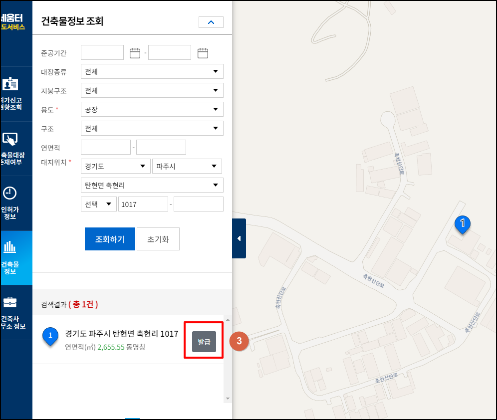 3) 건축물정보 입력 - 조회하기 클릭 - 발급 클릭