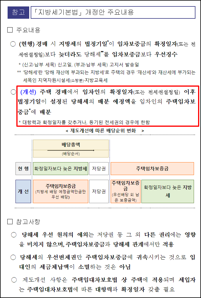 경ㆍ공매시 해당 주택에 부과되는 당해세 중 주택임차보증금의 확정일자보다 늦은 당해세(국세 및 지방세)의 배분 한도만큼 주택임차보증금이 우선 변제받도록 개선