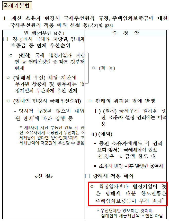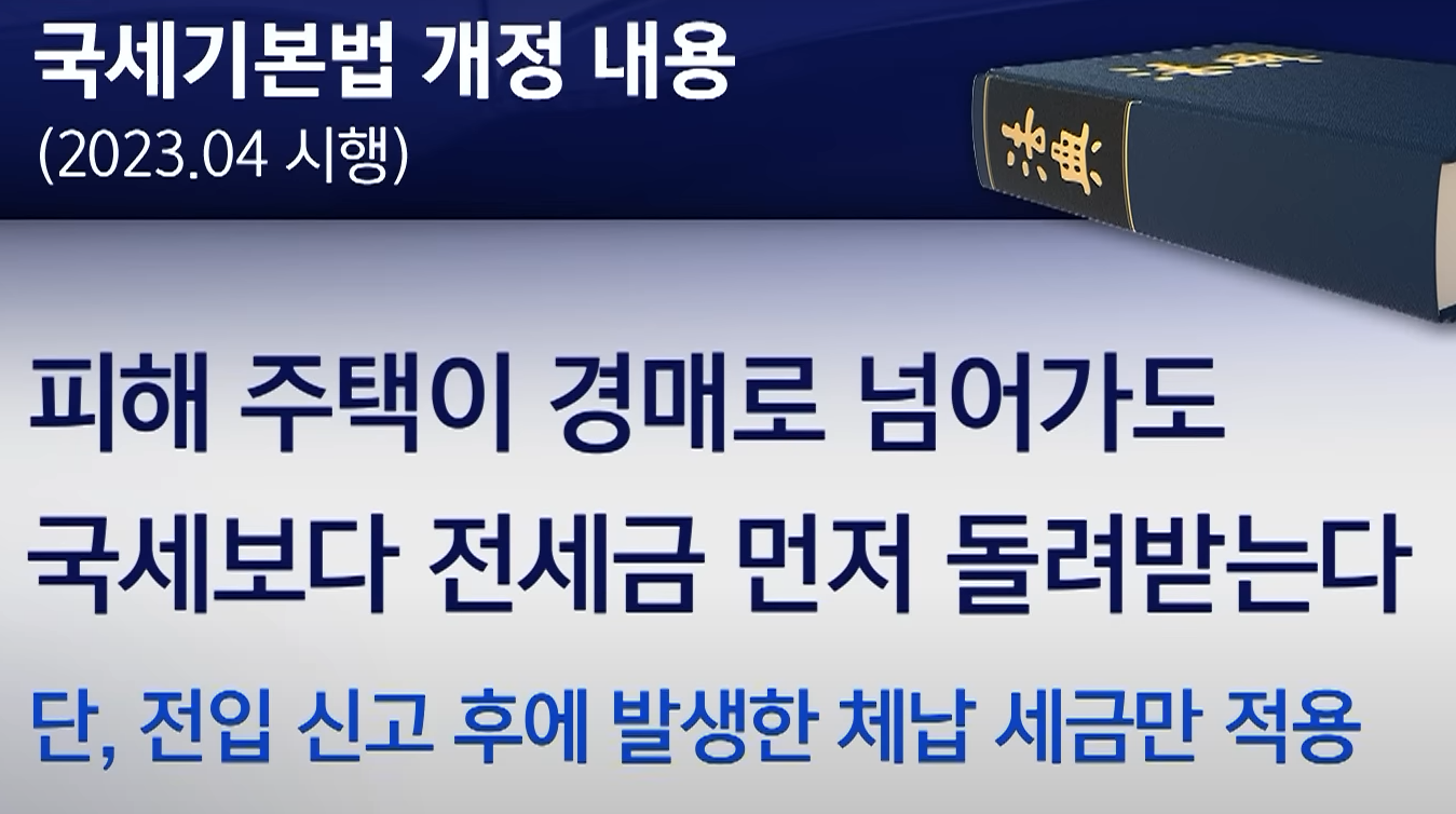 23년 4월 1일(국세), 23년 5월 4일(지방세)부터 확정일자 이후 발생한 체납세금에 한해 당해세(국세/지방세)보다 전세금을 먼저 배당받습니다.