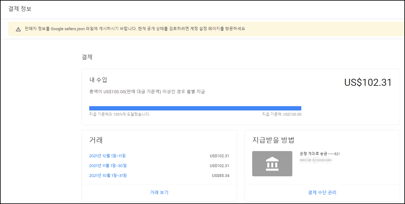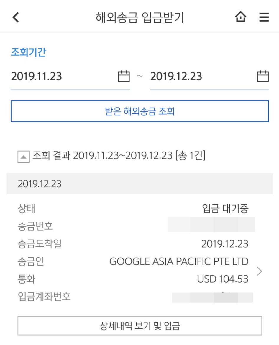 구글 수익은 별도의 신청과정 없이 100$ 이상인 경우 매달 21일에 내가 등록한 계좌로 입금시켜줍니다. 그냥 편하게 돈만 벌면 되는거죠. 하지만 해외송금이기때문에 바로 내 계좌로 입금되진 않는다.