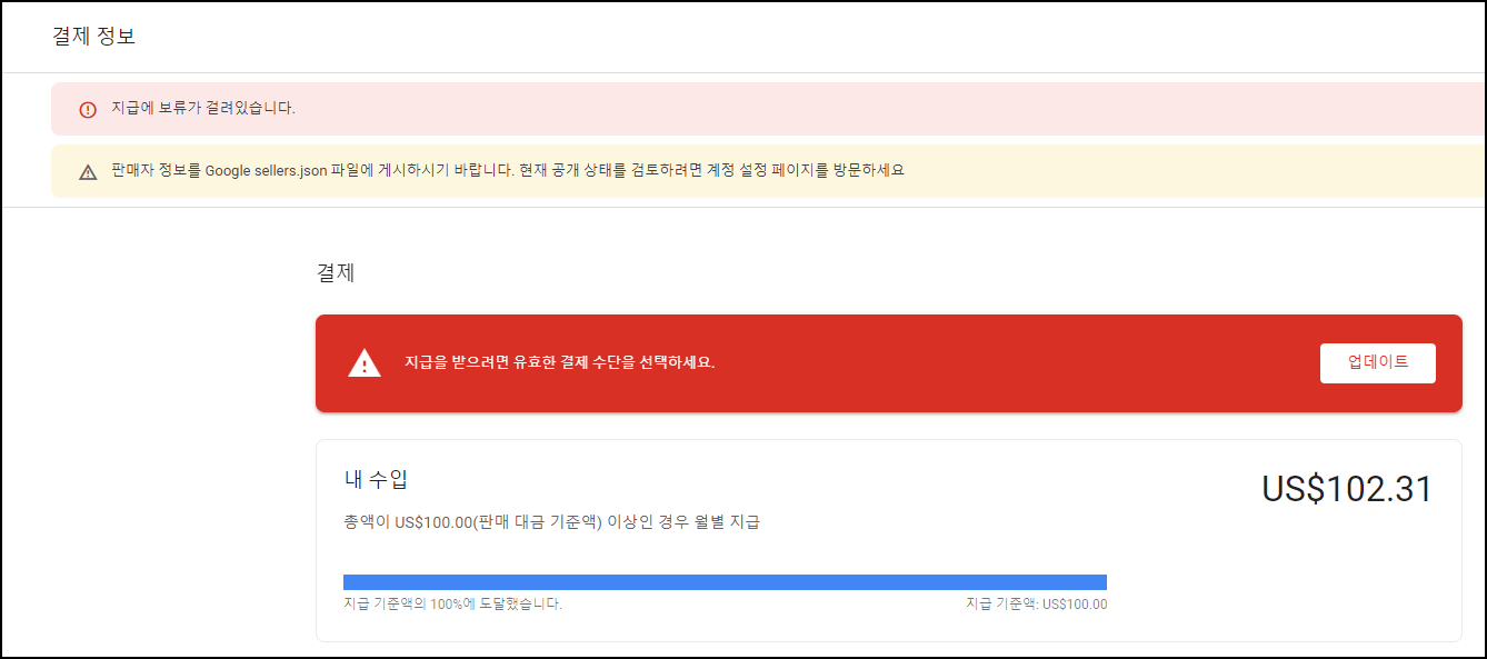 여기까지 마친 후 껏다가 애드센스를 다시 켜보면 아래와 같이 '지급 보류'는 사라져있다.
