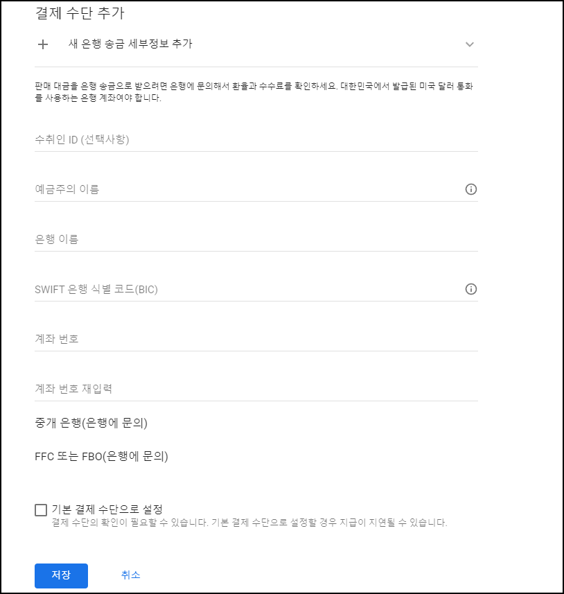 이후 위 표를 참고하여 결제 수단을 추가한다. 모든 내용은 영어로 작성해야하며, 영문명은 KIM MINSU 처럼 여권명으로 작성한다. (중개은행, FFC 또는 FBO는 미입력한다.)