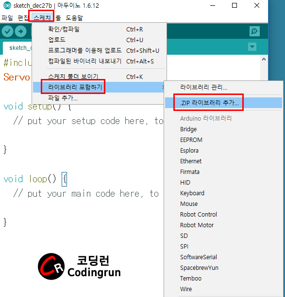 IDE에서 스케치 -> 라이브러리 포함하기 -> .ZIP 라이브러리 추가를 클릭해 줍니다.
