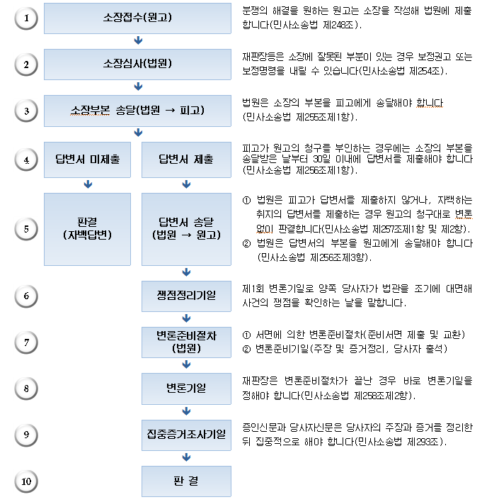 - 소송은 법원에 소장을 제출함으로써 제기한다.(민사소송법 제248조). 아울러 소장에는 소송목적의 값(소가)에 따른 소정의 인지를 붙여야 한다. (민사소송 등 인지법 제2조).