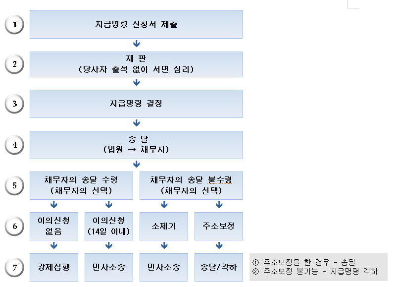 - 법원은 지급명령 신청서가 접수되면 이를 신속하게 심사한 후 특별한 사정이 없으면 바로 지급명령을 결정한다.