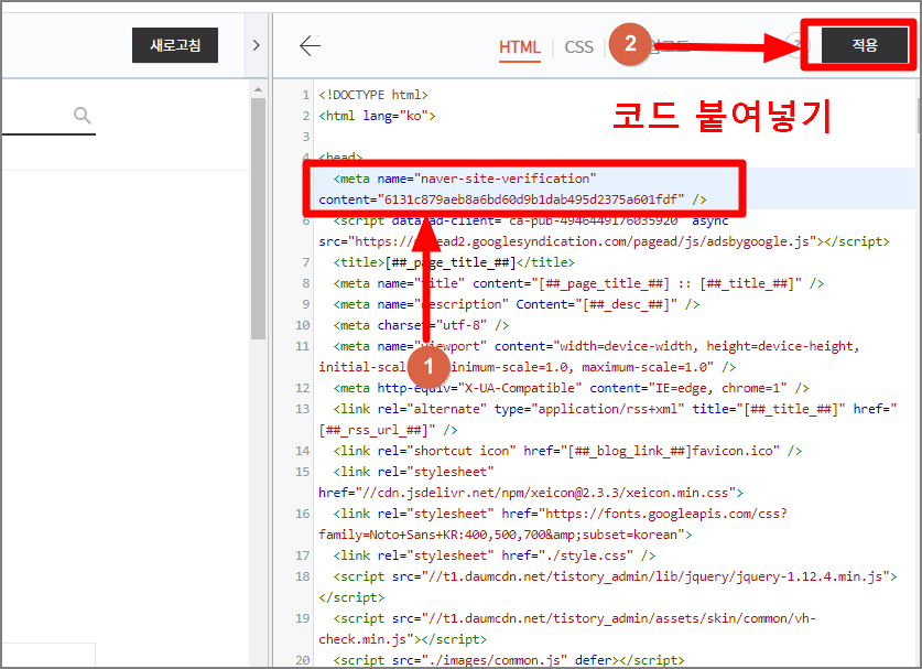 복사한 HTML 코드를 <head>와 </head> 사이에 넣는다. <head>와 </head>는 코드의 최상단에 위치해있다. <head>가 안보이면 Ctrl + F로 'head'를 검색하면 편하다. (참고로 사이에 아무줄에나 넣어도 상관없다.)