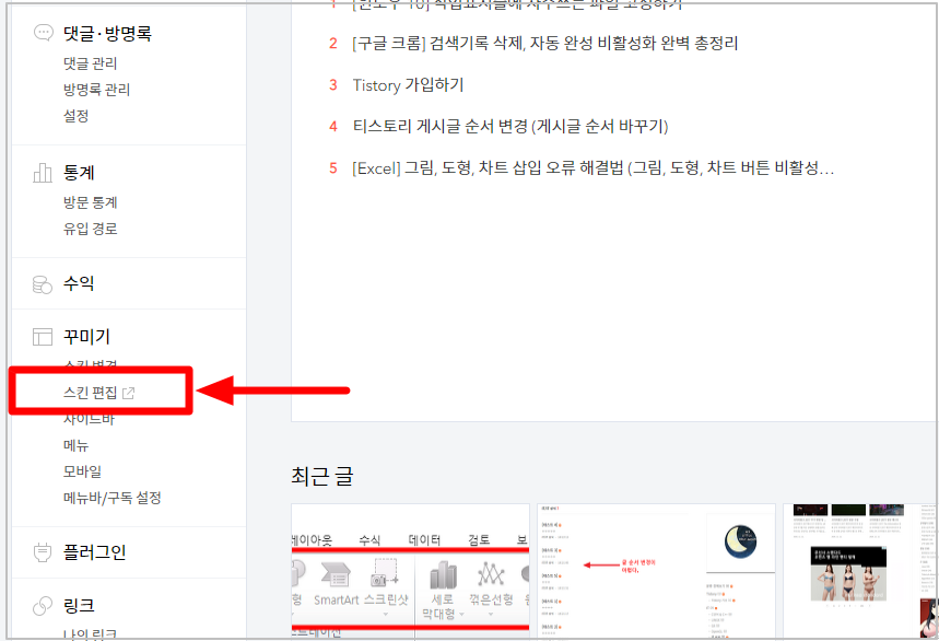 4-1. 티스토리 블로그관리 하단에 꾸미기 > 스킨 편집 클릭