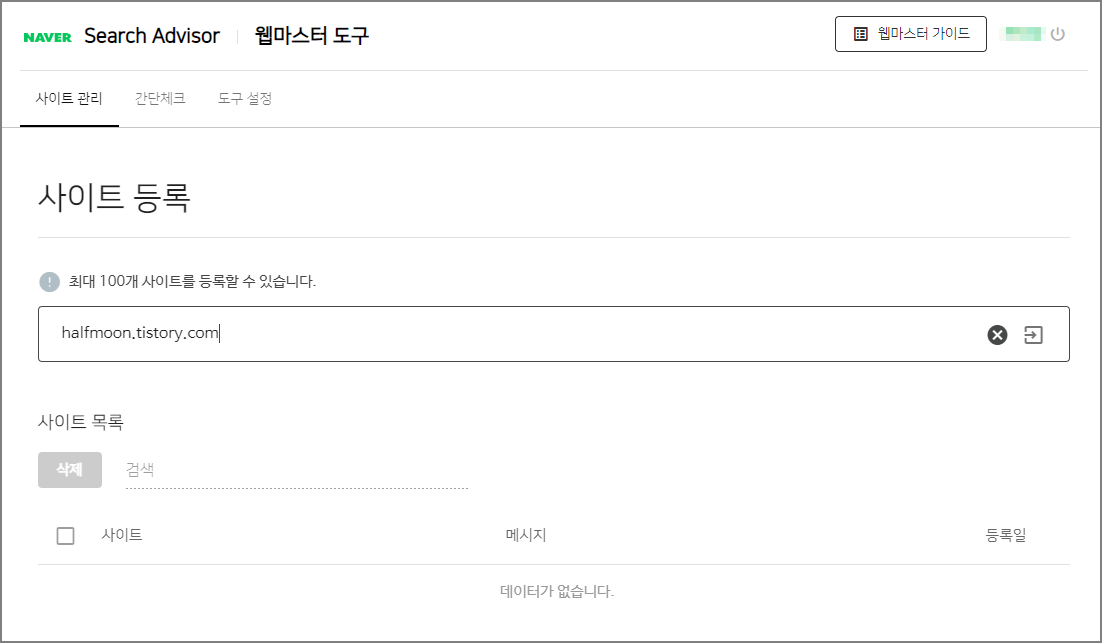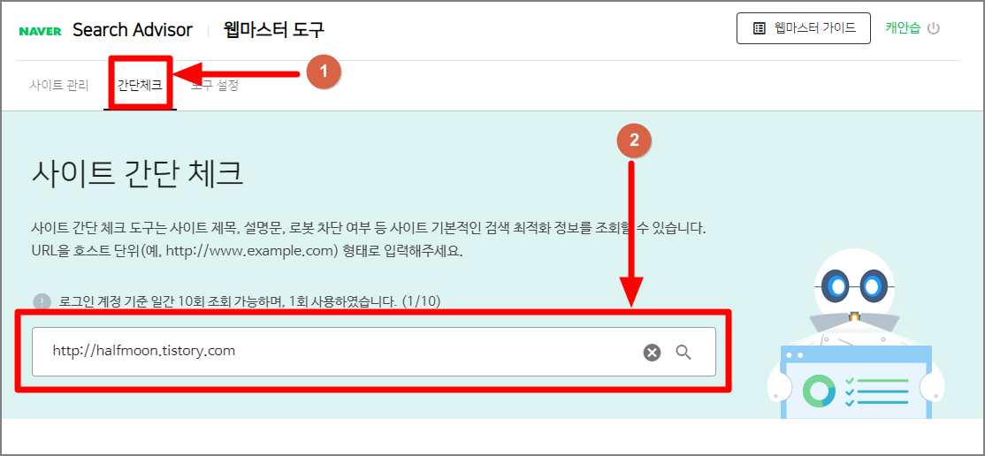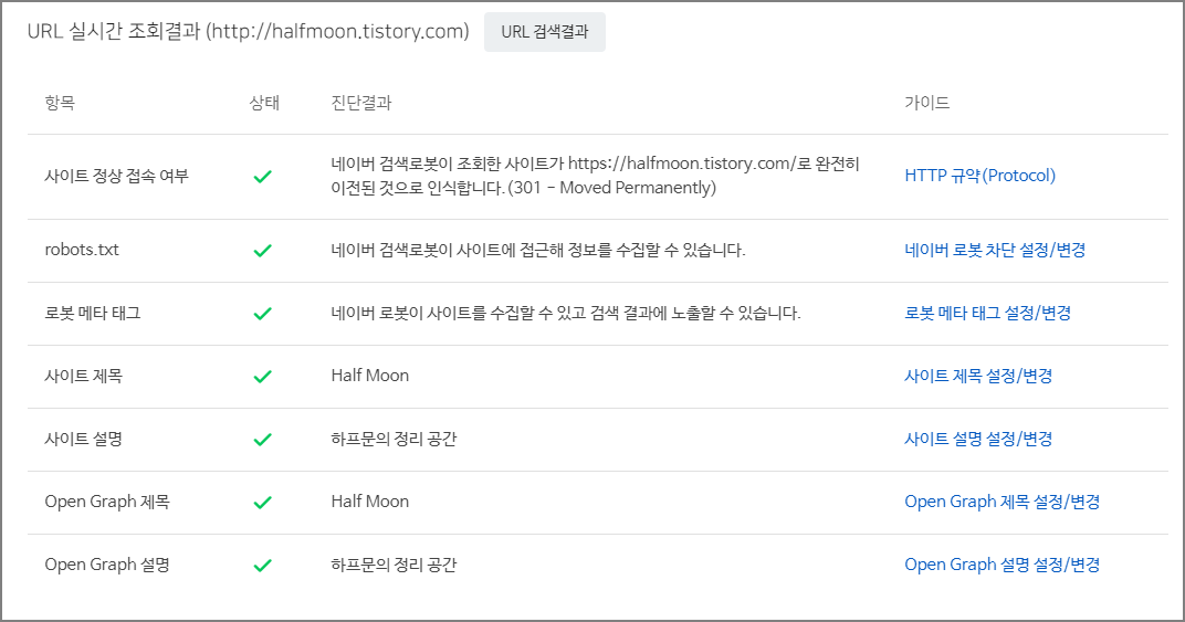 2. '간단체크' 항목에서 티스토리 URL 작성 후 엔터
