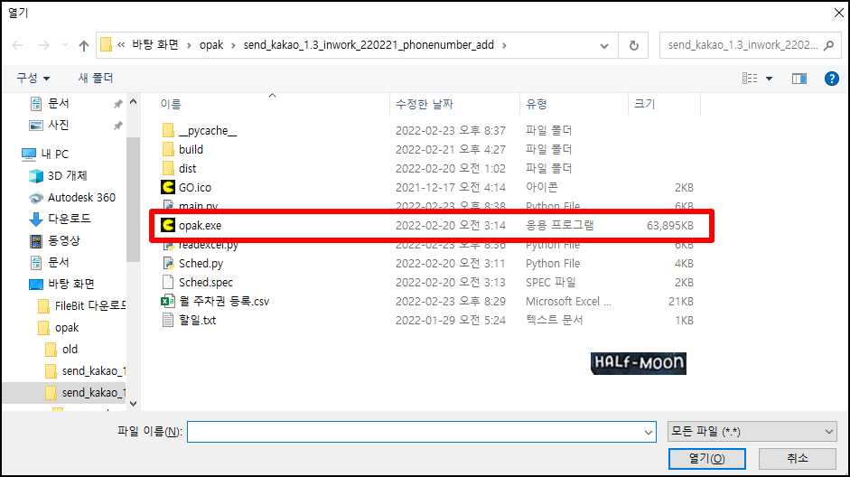 프로그램/스크립트(P) : C:\Users\PC\Desktop\opak\send_kakao_1.3_inwork_220221_phonenumber_add\opak.exe