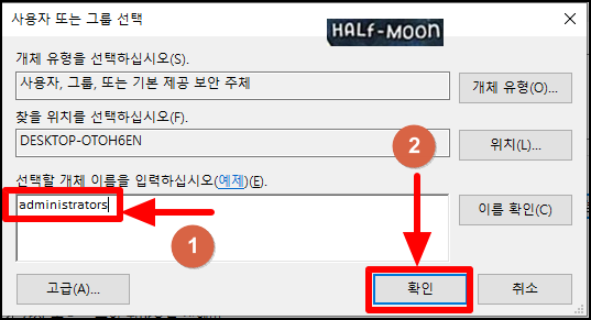 2) 선택할 개체 이름에 'administrators' 입력 후 '확인' 클릭