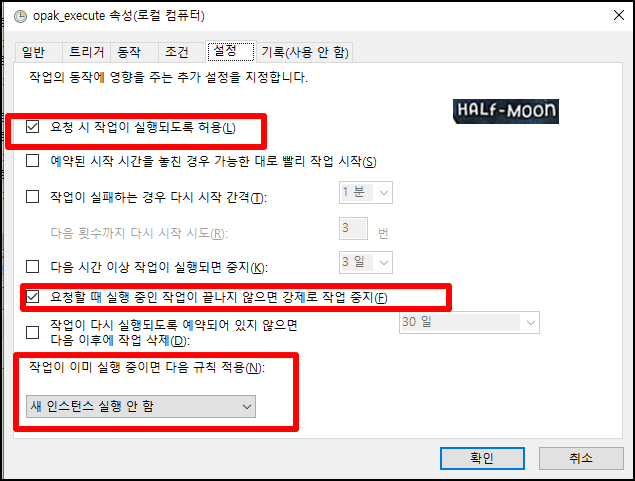 - '요청할 때 실행중인 작업이 끝나지 않으면 강제로 작업 중지' 선택