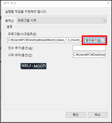 1) 프로그램/스크립트(P)에서 '찾아보기' 클릭 - 실행하고자 하는 프로그램 선택