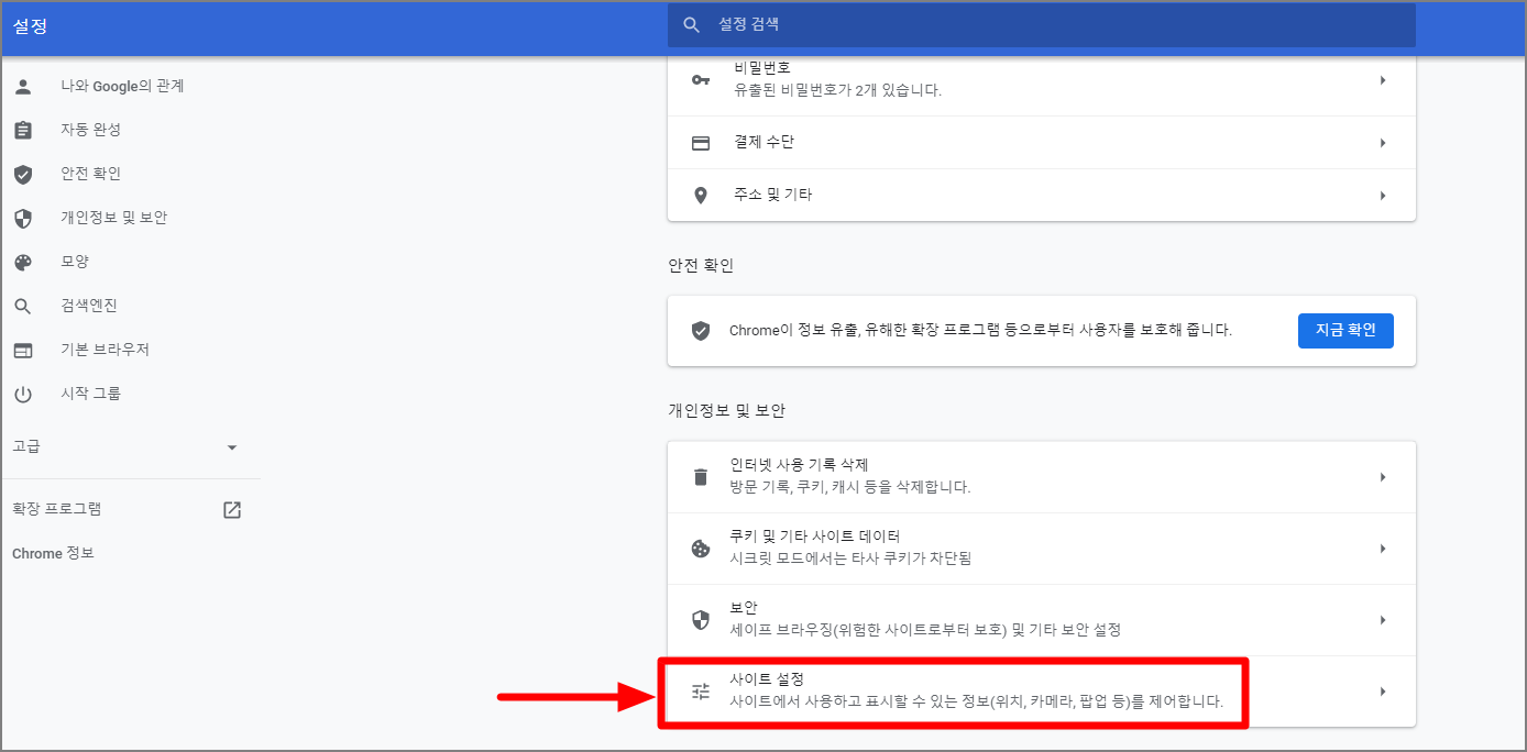 2. 개인정보 및 보안 탭에 '사이트 설정' 클릭