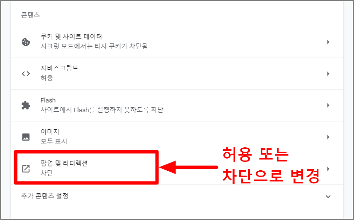 3. 콘텐츠 탭에 '팝업 및 리디렉션' > 차단 혹은 허용 설정