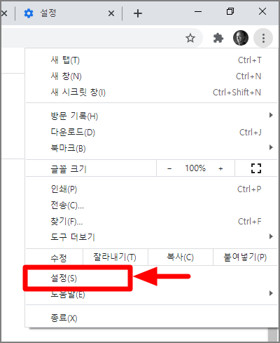 1. 구글 크롬 우측 상단에 '설정' 클릭